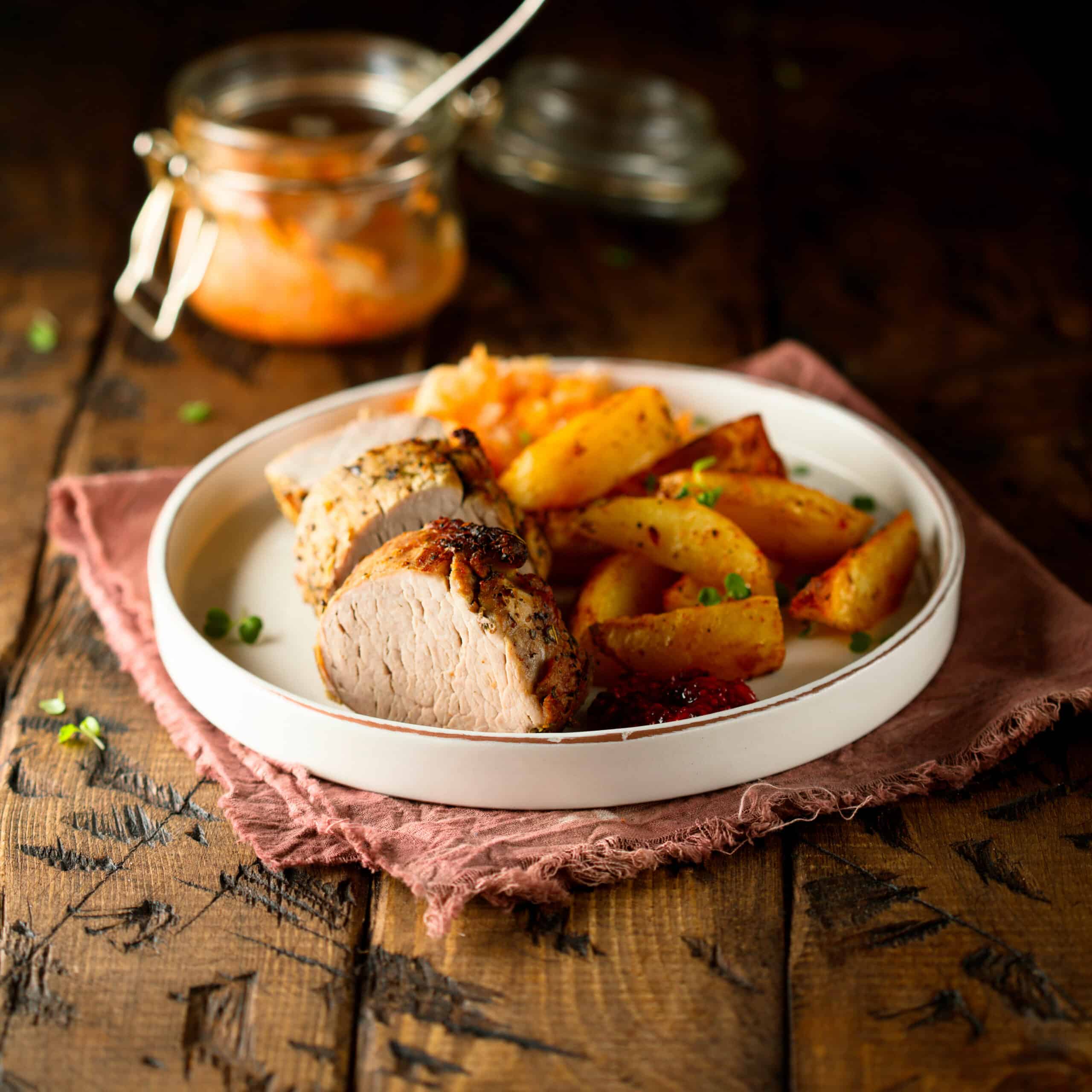 Côte de porc au filet, sauce au chou kale et purée à la patate douce