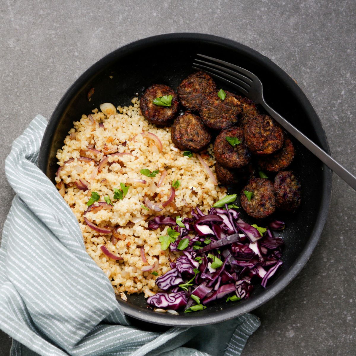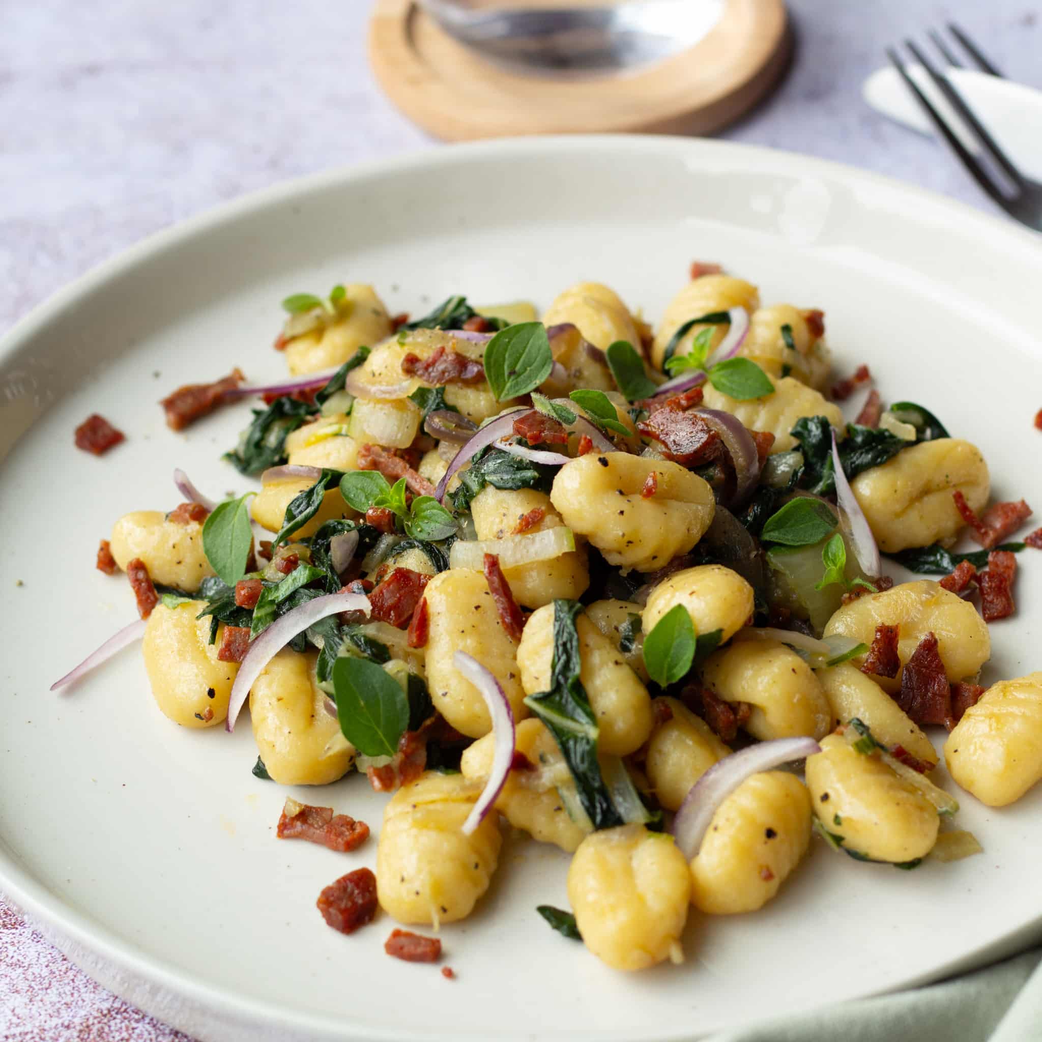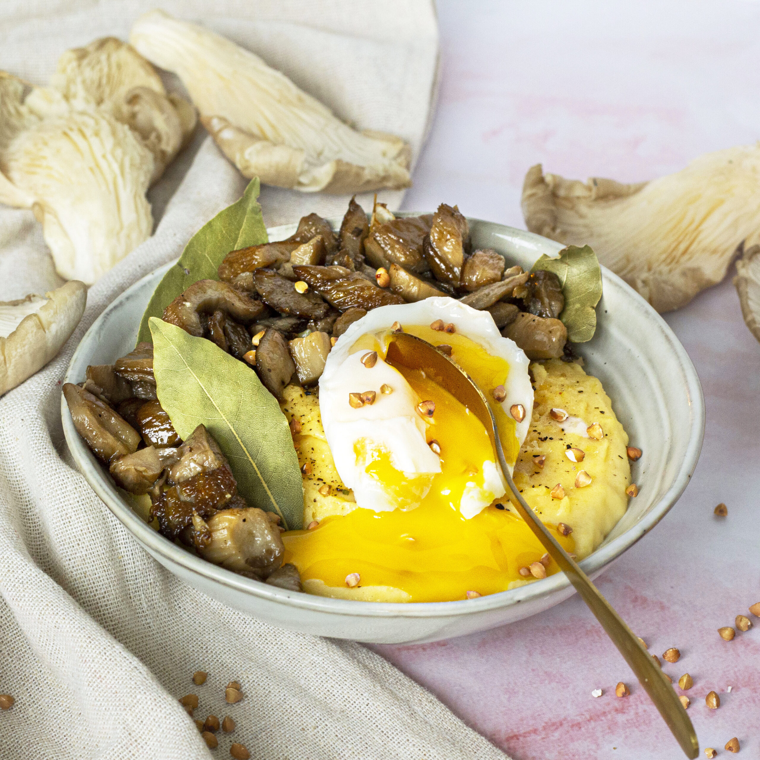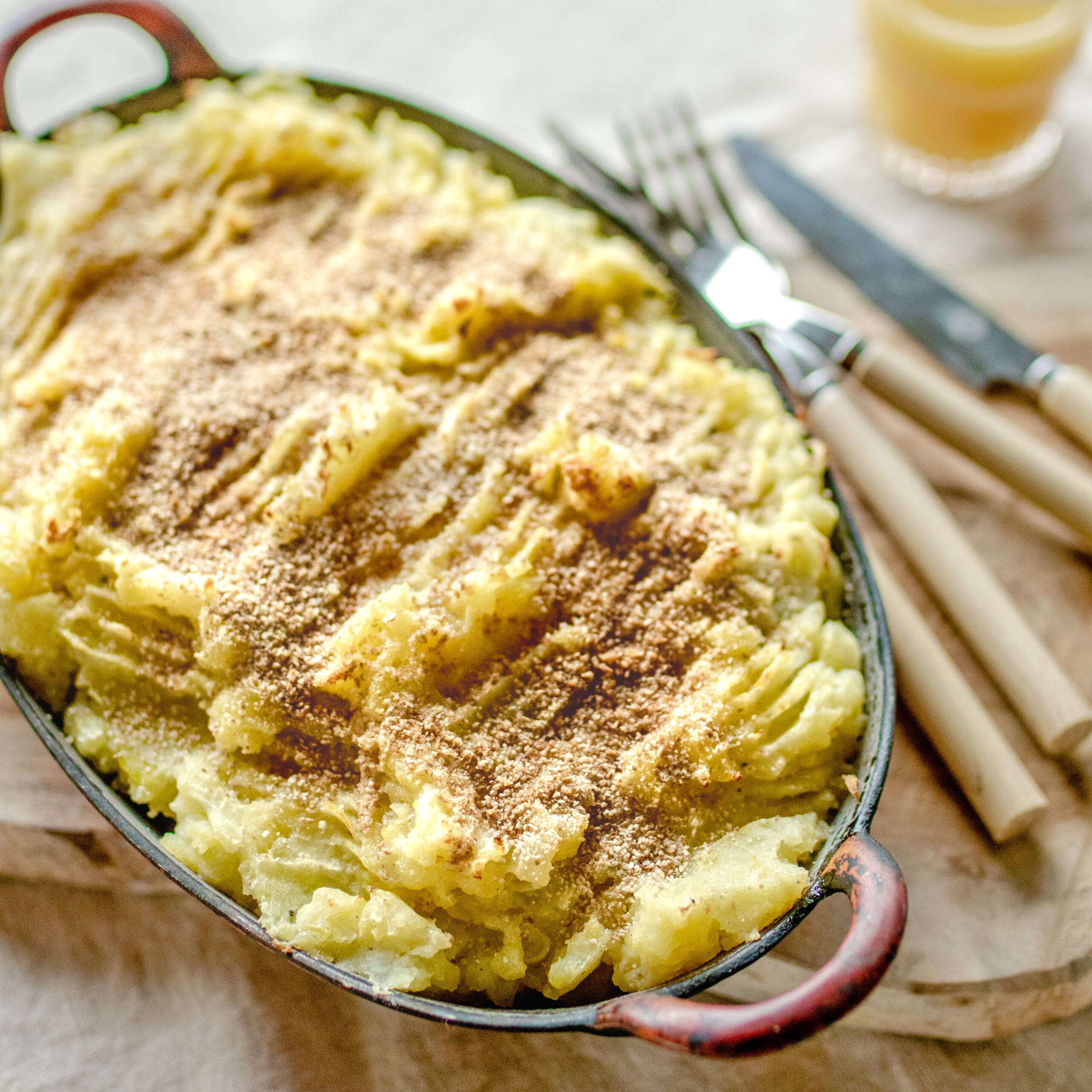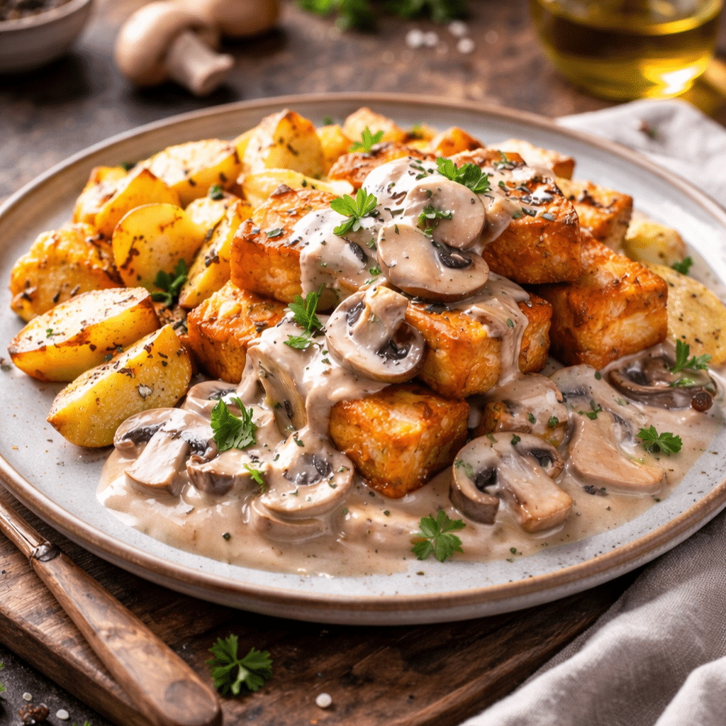 Tofu croustillant, pommes de terre rôties & sauce crémeuse aux champignons