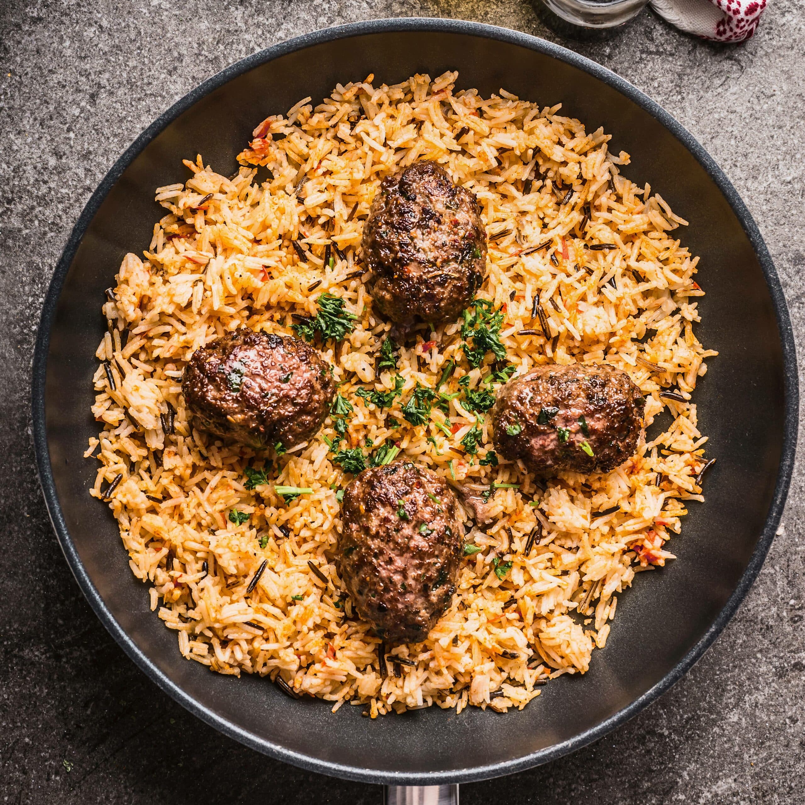 Boulettes de poulet au gingembre, riz sauvage et salade de chou à la pomme*