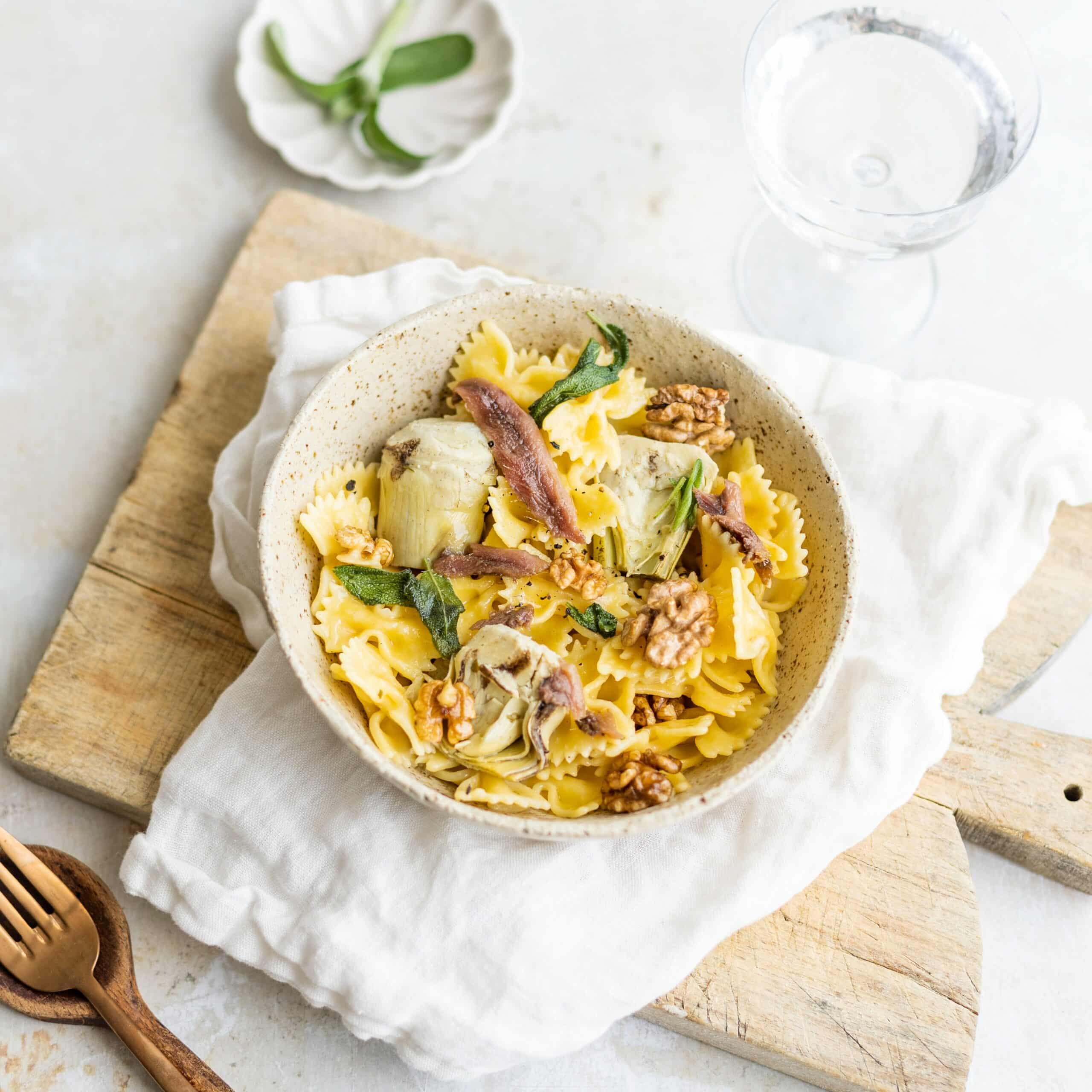 Farfalle aux artichauts, beurre de sauge, anchois et noix*